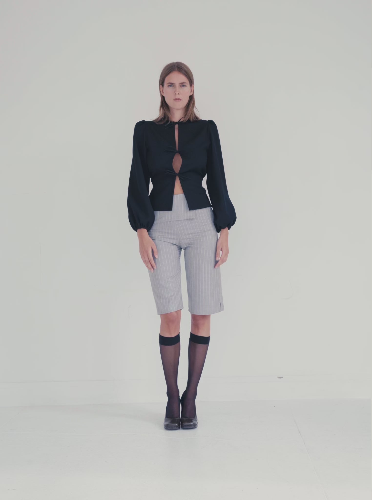 Ava, la blouse réversible en laine qui signe une allure féminine et moderne. Ses manches bouffantes et sa taille ajustée structurent la silhouette avec élégance.