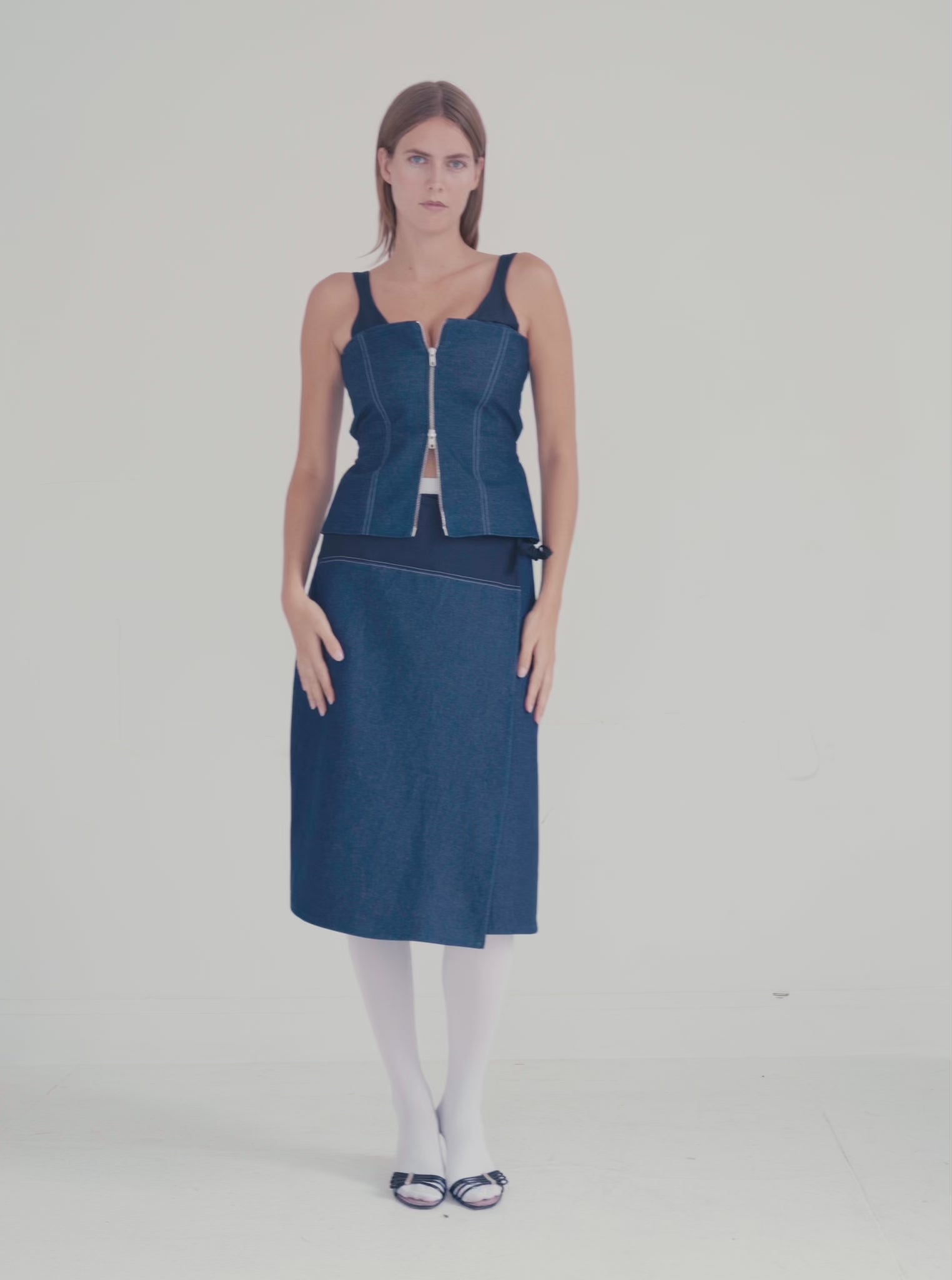 Brune, le bustier en laine et denim, une pièce forte d'inspiration couture.