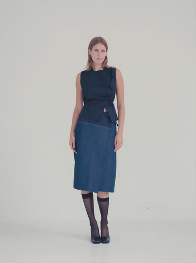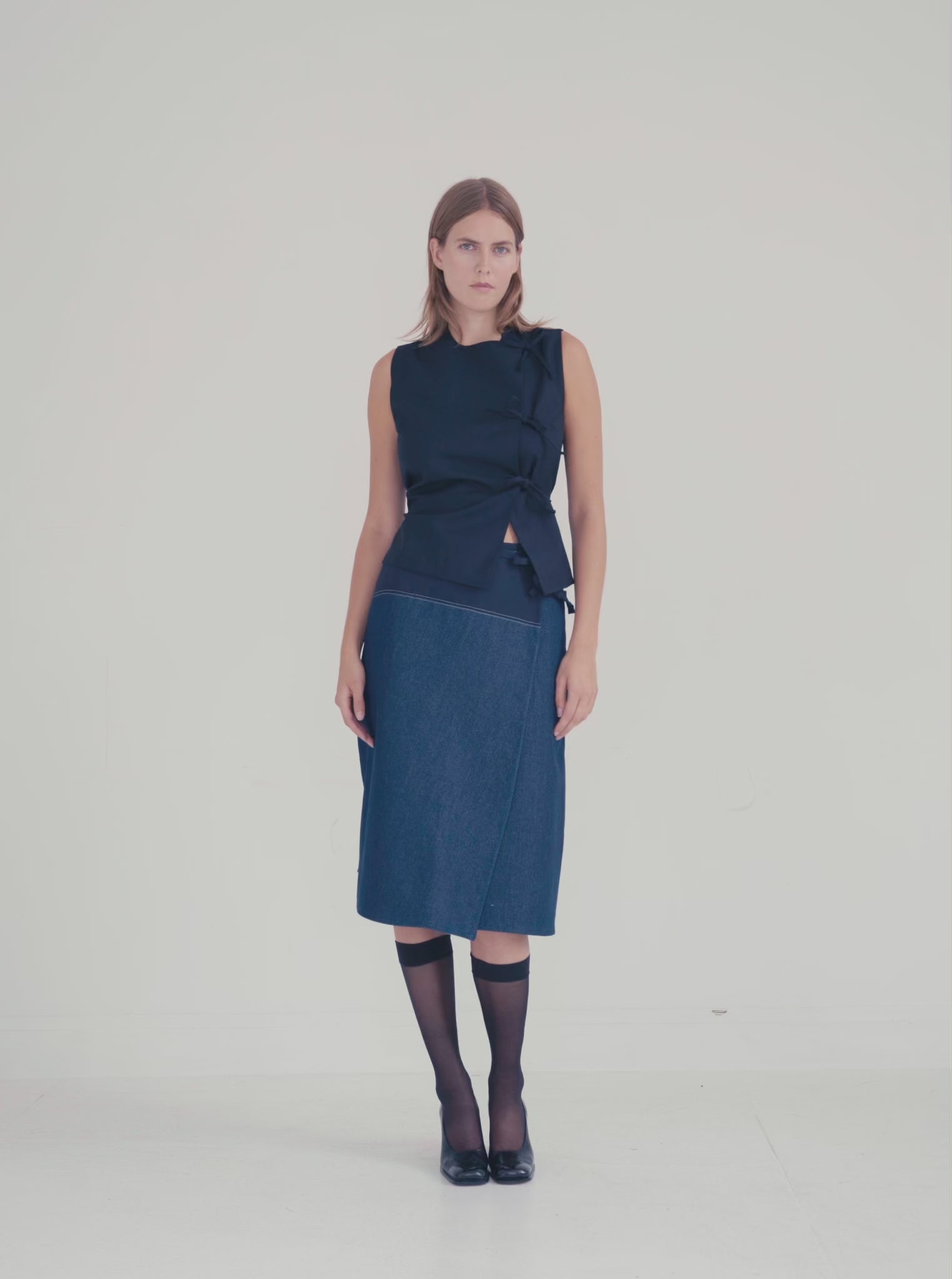 Pénélope, la jupe portefeuille mi-longue en laine et denim.