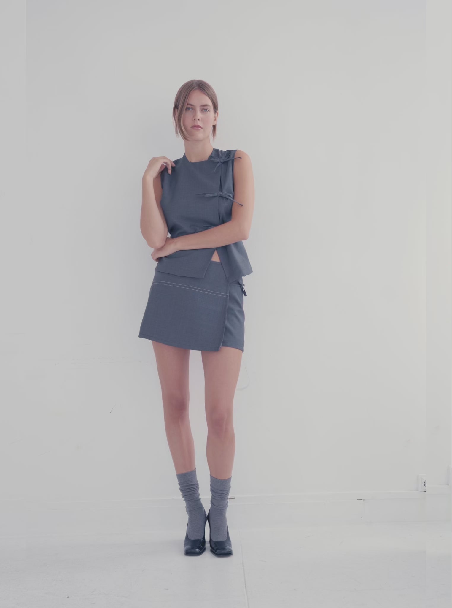 Gisèle, la mini-jupe portefeuille pensée pour se porter seule ou superposée sur le pantalon Quitterie.