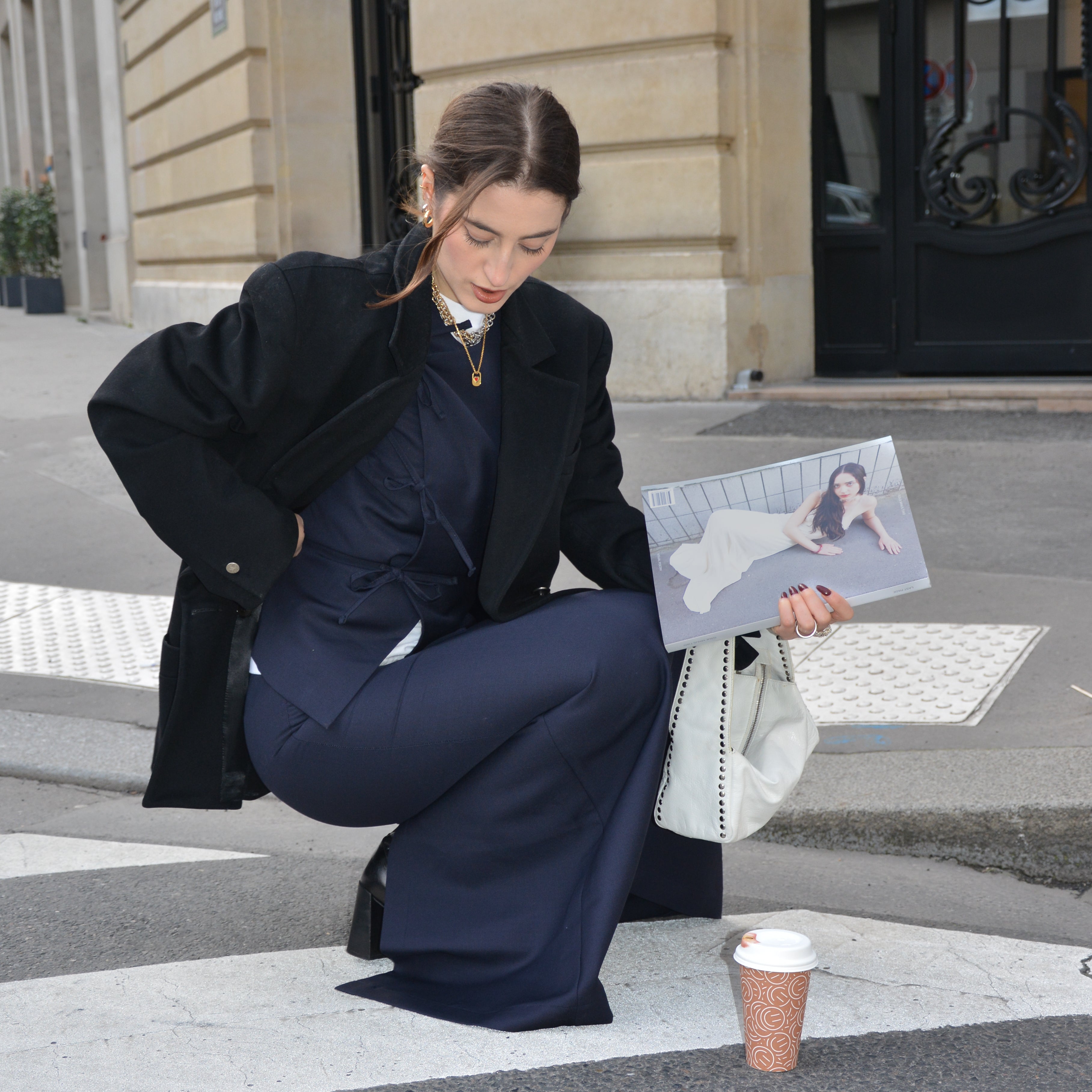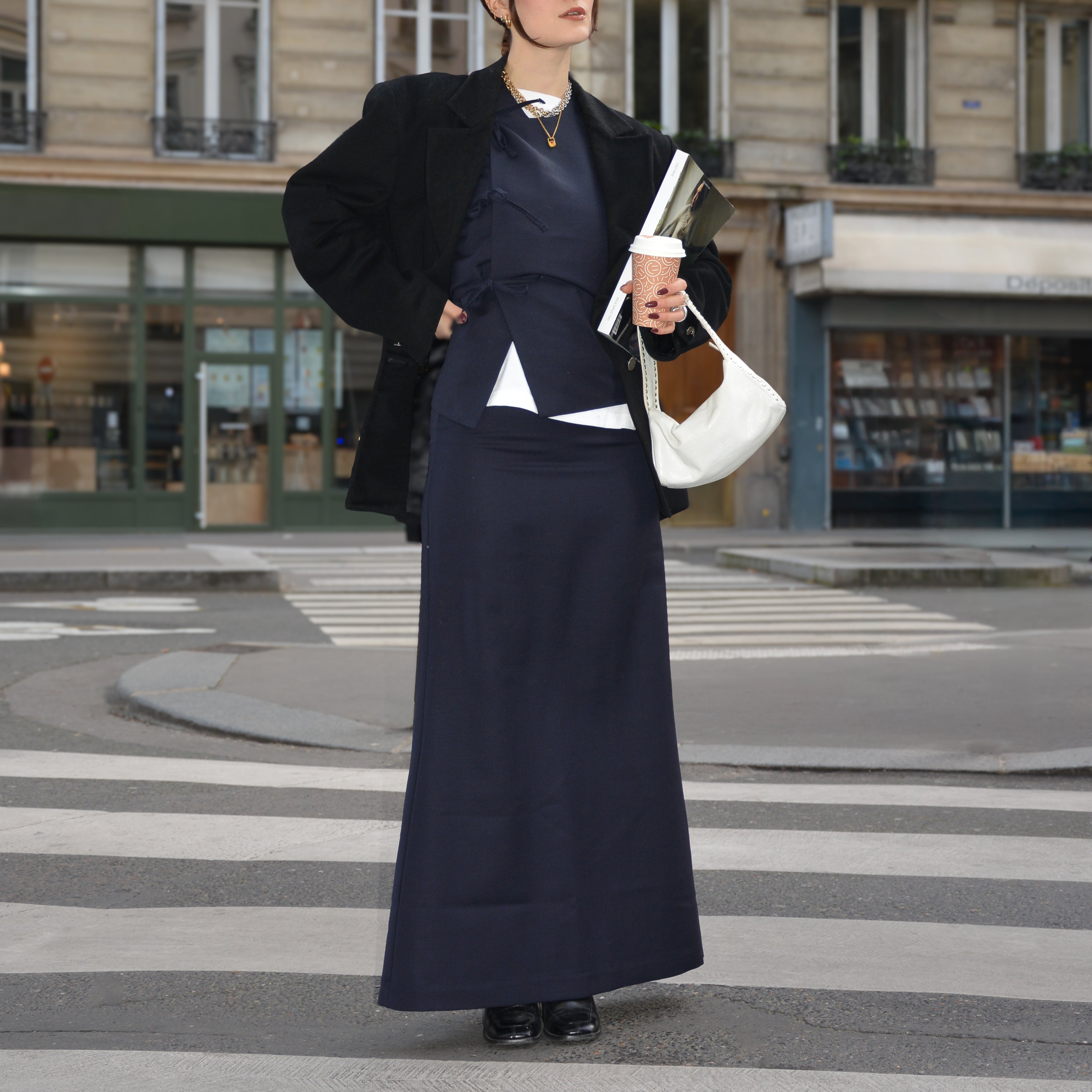 Elle épouse la courbe des hanches et allonge la silhouette, tandis qu’une fente discrète dans le dos accompagne le mouvement.